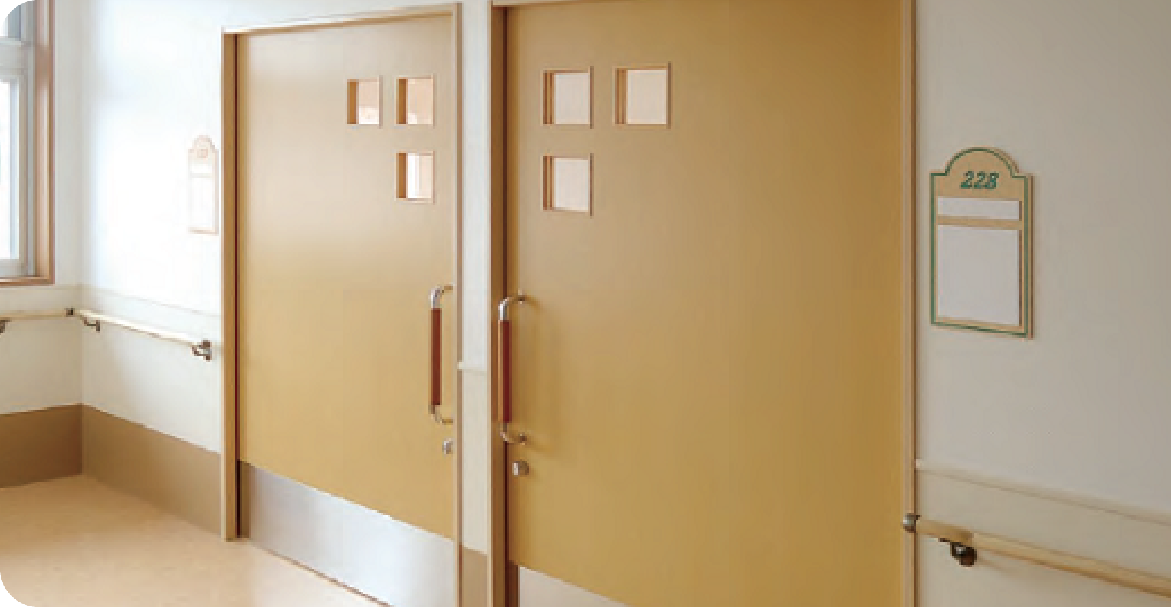 病院・医療・老健施設・教育施設などに使用される建具は不特定多数の大人から子供までが日常で幾度となくふれあうため、最も安全•安心•静かで使いやすくなくてはなりません。求められているのは、使いやすさ・デザイン性・安全性だけでなく心地よさも必要です。そして忘れてはいけないのが環境への配應だと思います。それらの期待に応えられるように弊社は様々な商品をご用意してどんな案件にも臨機応変にご対応させていただきます。